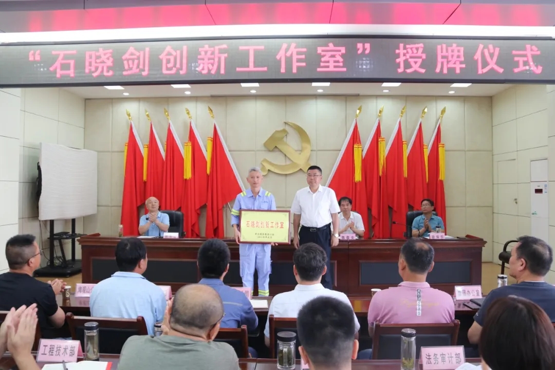 三樓會議室座無虛席,公司領(lǐng)導(dǎo)班子,機(jī)關(guān)部室負(fù)責(zé)人、基層單位分管領(lǐng)導(dǎo)及技術(shù)骨干、職工代表等40余人共同見證授牌時(shí)刻。湖北省首席工人技師、公司首席電氣工程師石曉劍進(jìn)行表態(tài)發(fā)言,公司黨委書記、董事長、總經(jīng)理余曦親自將“石曉劍創(chuàng)新工作室”銅牌頒授到石曉劍手上。